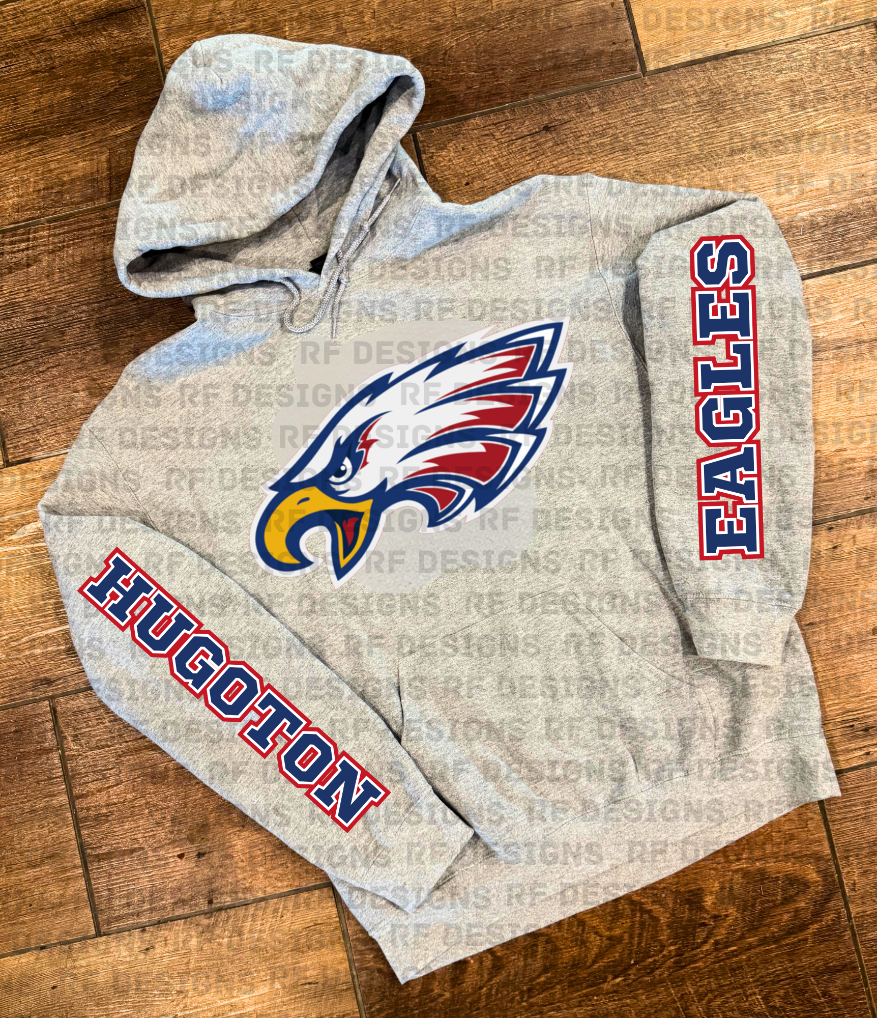 Athletic grey hoodie with the power eagle front and center and Hugoton on the right sleeve and Eagles on the left sleeve.