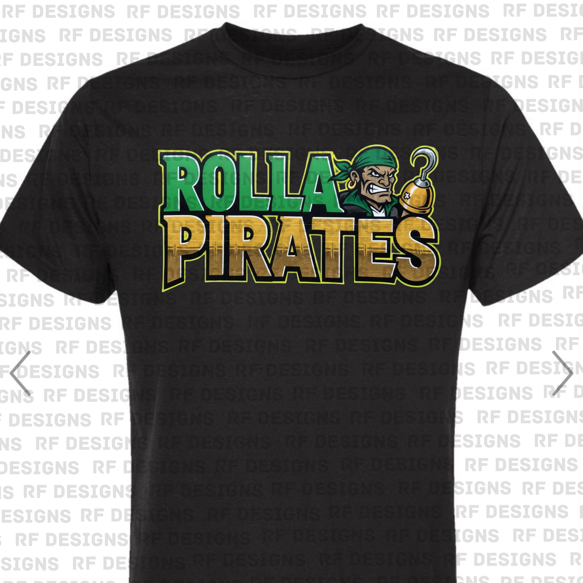Black t-shirt in your choice of either short sleeve or long sleeve with the Rolla Pirates design front and center.